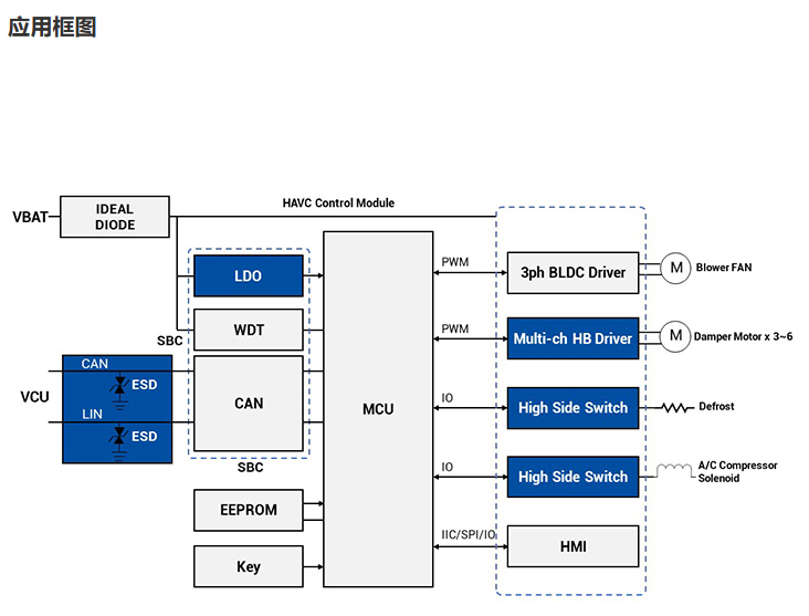 高能效的 HVAC 系统对于混合动力汽车/电动汽车至关重要。矽力杰无刷电机驱动器、降压转换器、MCU 等器件产品系列可帮助您为内燃机车辆或混合动力汽车/电动汽车设计高效的 HVAC 系统。